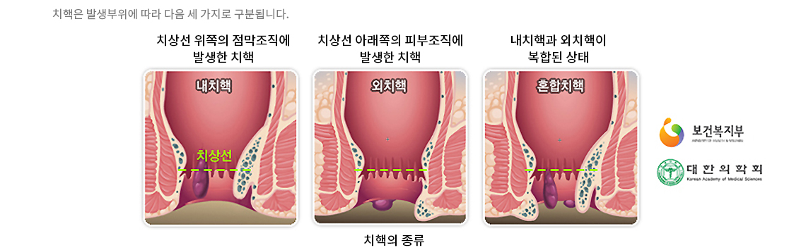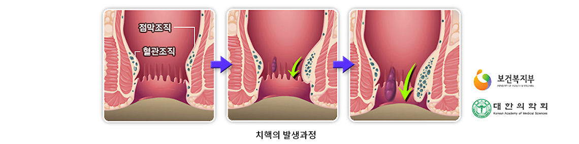 항문관을 형성하는 점막 아래에는 많은 수의 혈관이 그물처럼 잘 발달해 있으며, 어떤 원인에 의해 이들 혈관과 점막조직이 붓고 늘어나서 치핵이 발생합니다.