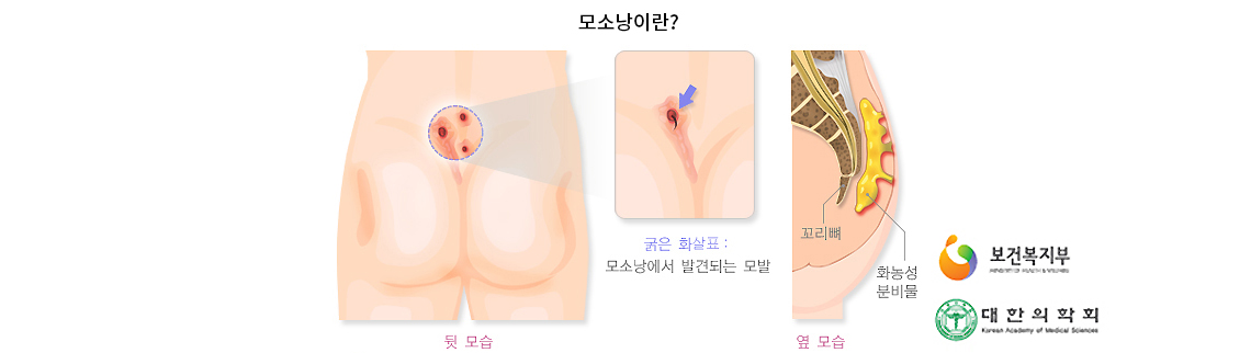 모소낭이란 피부와 피하 조직을 침범하는 모발과 연관된 만성 염증성 질환으로, 모소동이나 모소질환이라고 불립니다. 모소낭은 대부분 항문 후방 엉덩이 꼬리뼈부분의 둔부열에 발생하며, 외부에서 보면 정중앙에 구멍이 있으면서 머리쪽으로 관을 형성하고 있으며 정중선 바깥쪽으로 이차 누관을 형성하는 경우가 많습니다.