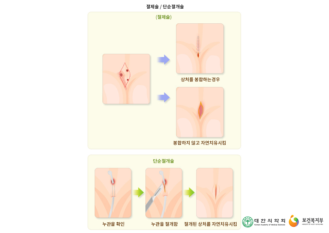 중앙에 있는 구멍만 없앤 후 누관은 그대로 두고 깨끗이 닦아 주기만 하면서, 이차적 상처 치유로 누관이 막히는 것을 기다리는 방법으로, 가장 보존적인 수술 방법입니다.