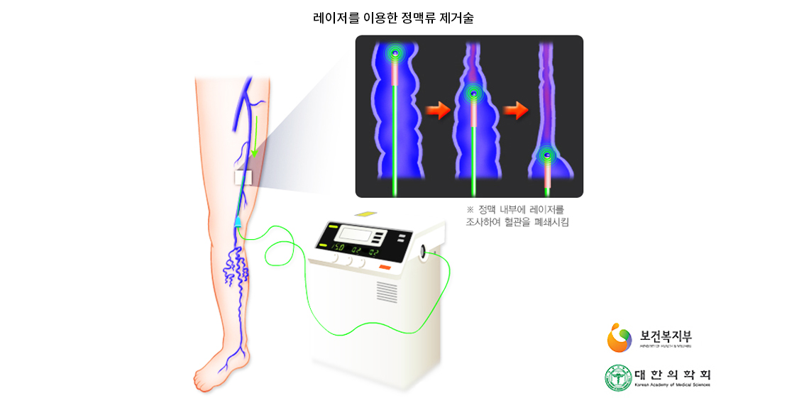 레이저나 고주파를 이용한 정맥류의 제거술은 현재 두렁정맥 제거술을 대신하여 효과적인 치료로 각광을 받고 있습니다. 미국이나 유럽에서는 두렁정맥 역류를 동반한 정맥류의 경우 수술적 두렁정맥 제거술 보다 두렁정맥의 표준치료로 선택되고 있습니다. 이는 두렁정맥이나 정맥류 내로 레이저나 고주파를 전달하는 레이저 화이버나 고주파 카테터를 삽입한 후에, 이를 통한 열 에너지로 혈관내막에 손상을 가하여 혈전생성이나 섬유화를 통해 혈관을 수축 및 폐쇄시키는 방법입니다.